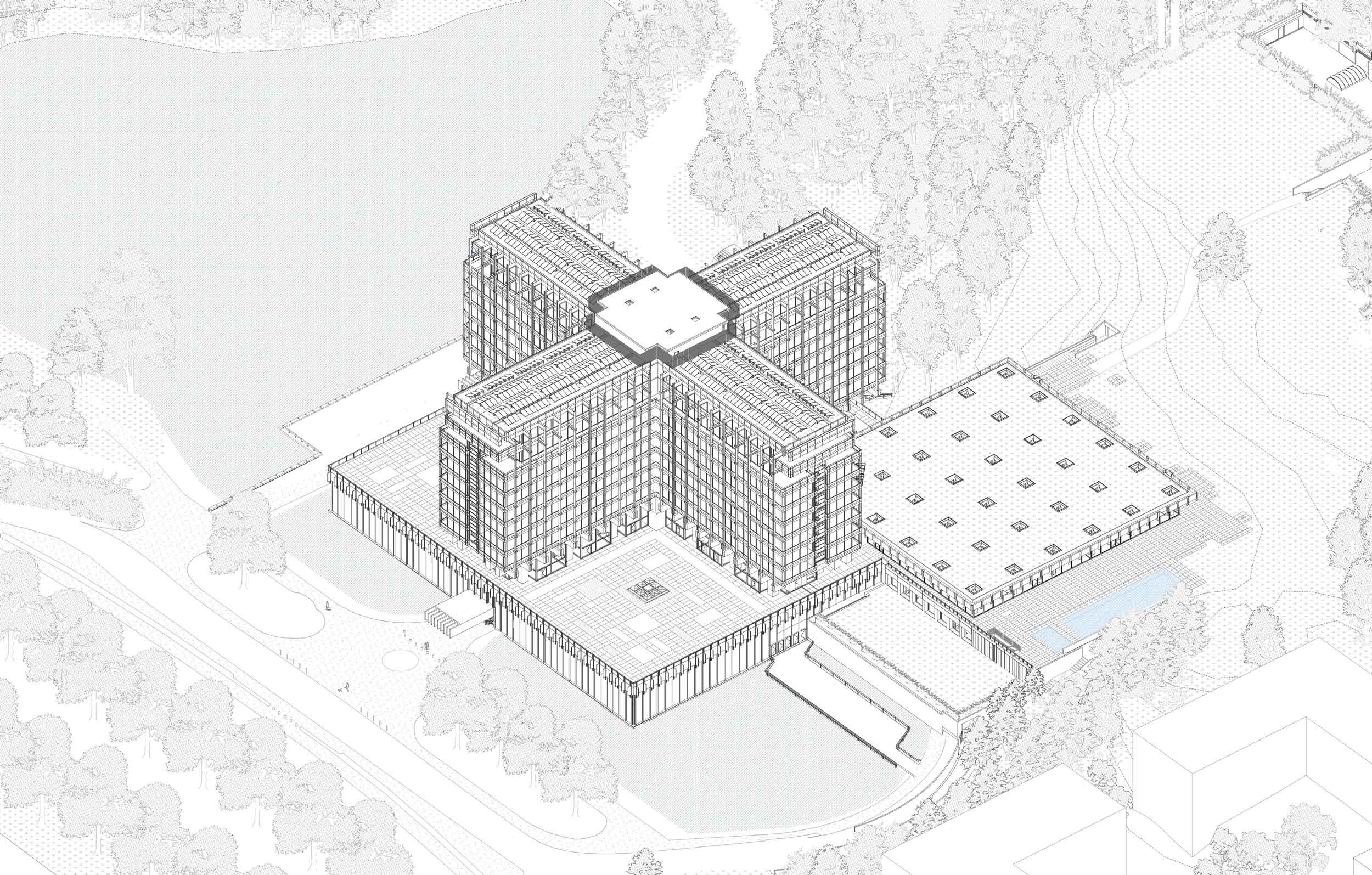 Conçu par l’architecte belge René Stapels dans les années ‘60, l’ancien siège social de la Royale Belge à Watermael-Boitsfort, ainsi que son parc paysager, a été protégé en tant que site du patrimoine régional en 2019. L’ancien immeuble de bureaux est organisé comme une tour cruciforme au-dessus d’un très grand soccle de deux étages.