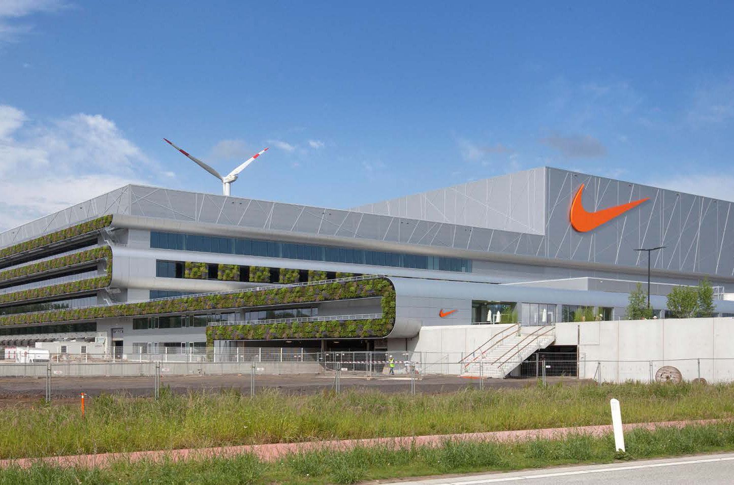 Nike a étendu son Centre logistique européen à Ham par un nouveau complexe innovant. L’ensemble du complexe est constitué, outre l’immeuble de bureaux, de différents blocs ; low-bay, zone des convoyeurs et deux high-bays. Dans ces high-bays, jusqu’à 18 millions de paires de chaussures peuvent être stockées. Pour les techniques en acier des high-bays, l’équipe de conception a appliqué le principe clad-racking, une structure d’étagère totale en acier formé à froid galvanisé qui fait office d’espace de stockage et de structure supportant la façade arrière.