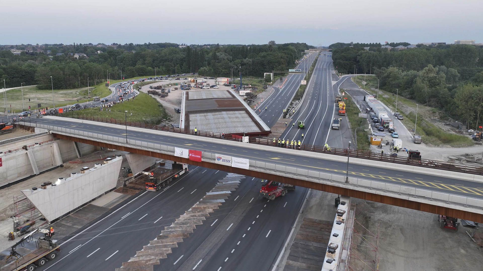 Le pont routier qui enjambe le Ring de Bruxelles à Zaventem était vétuste et peu sûr. Il a été remplacé par un nouveau pont en acier auto-patinable (‘corten’).