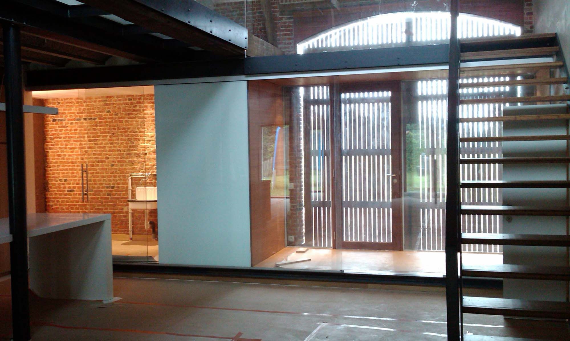 Le hall d’entrée fait partie d’un volume à poutres intégré qui abrite également les sanitaires. Cette caisse autoporteuse, constituée d’une charpente légère, accueille le passage vers l’étage. La partie nuit a été accrochée dans la grange par le biais d’une structure légère en acier. On peut accéder aux chambres à coucher en empruntant une passerelle en acier, faite d’acier plat recouvert de verre acidifié opaque. L’acier a offert la possibilité de sections minimales pour les parties structurelles et de finitions spécifiques pour l’intérieur par l’application d’acier brut huilé.