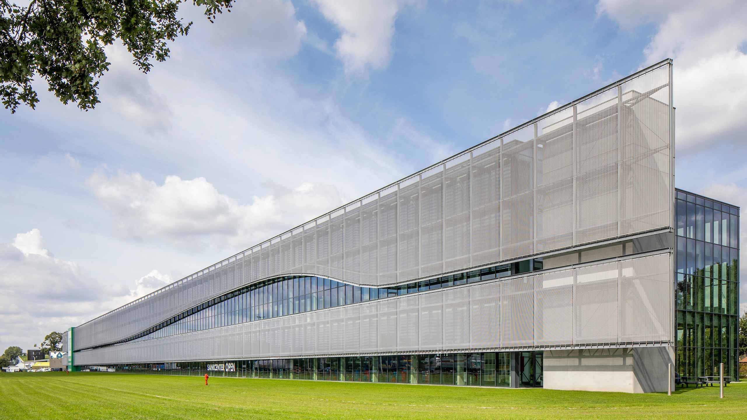 Une façade de pas moins de 300 m de long, juste à côté de l’autoroute E40 très fréquentée : pas étonnant que le nouveau siège flamand de FACQ à Merelbeke attire l’attention. C’est surtout le mur-rideau allongé, revêtu d’acier inoxydable légèrement ondulé, qui donne à l’ensemble un aspect très élégant et dynamique. La partie de façade fermée, comportant le logo vert et blanc caractéristique de l’entreprise, complète le tableau.