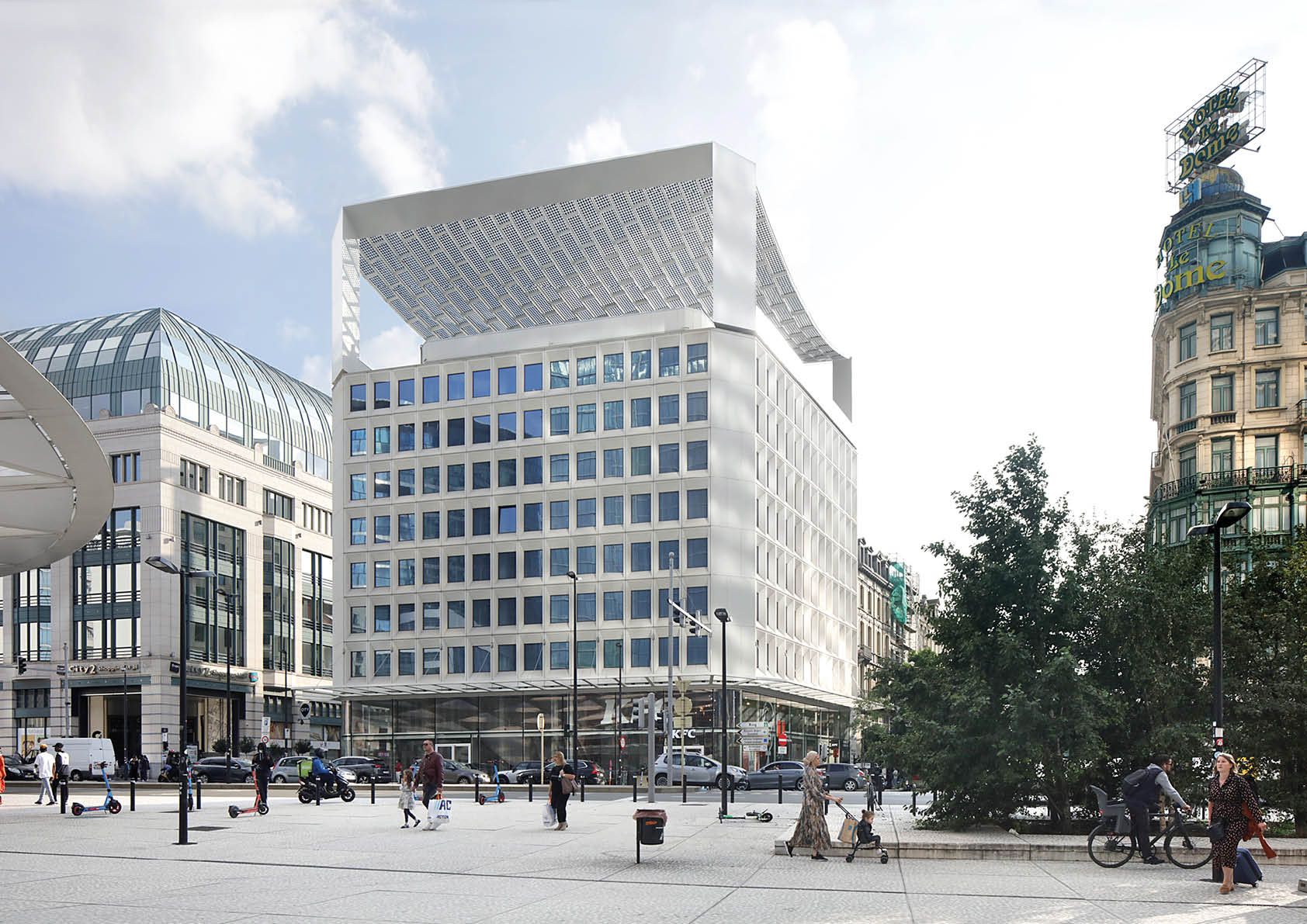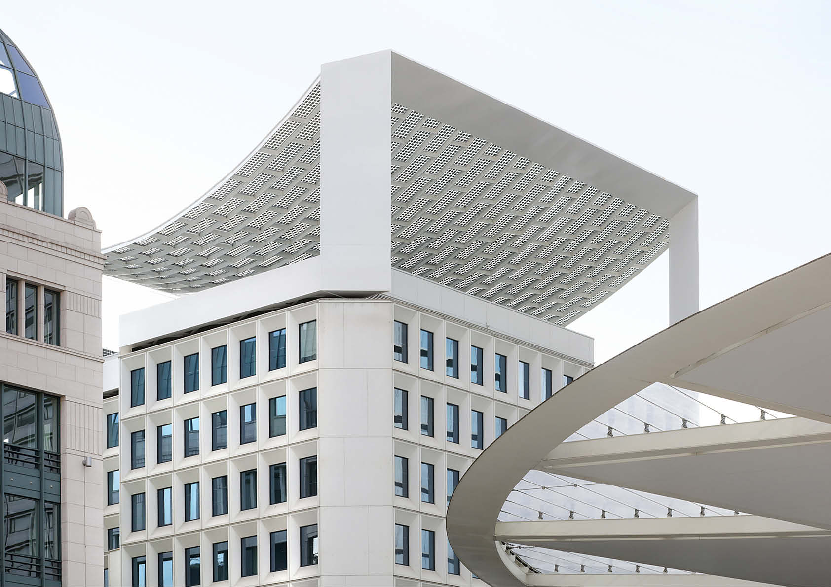 Sinds kort prijkt de Bota Solar-luifel bovenop een gerenoveerd kantoorgebouw uit de jaren 70 in het hartje van Brussel. Hij wekt zonne-energie op en filtert zonnestralen.